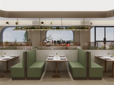 今天分享的是銀川預海餐廳設計裝修效果圖。設計師首先要與甲方客戶確定好餐廳改造的設計風格和主題,基于當?shù)氐奈幕?、歷史、自然景觀與特定的概念。風格與餐主題的一致性能夠增強餐廳的品牌形象力和吸引力。主案設計師根據(jù)客戶的設計裝修需求,為其打造出的餐廳設計裝修方案。本餐廳設計融合了古樸韻味與現(xiàn)代簡約美學,通過棕色、原木色、綠色主色與天然材質的交織,打造出一處具有人文溫度與自然靈性的沉浸式用餐空間。從深咖原木到淺駝墻面,層層遞進的棕色奠定沉穩(wěn)基調,綠色的皮質沙發(fā)又很清新脫俗,整體給食客的觀感很好。